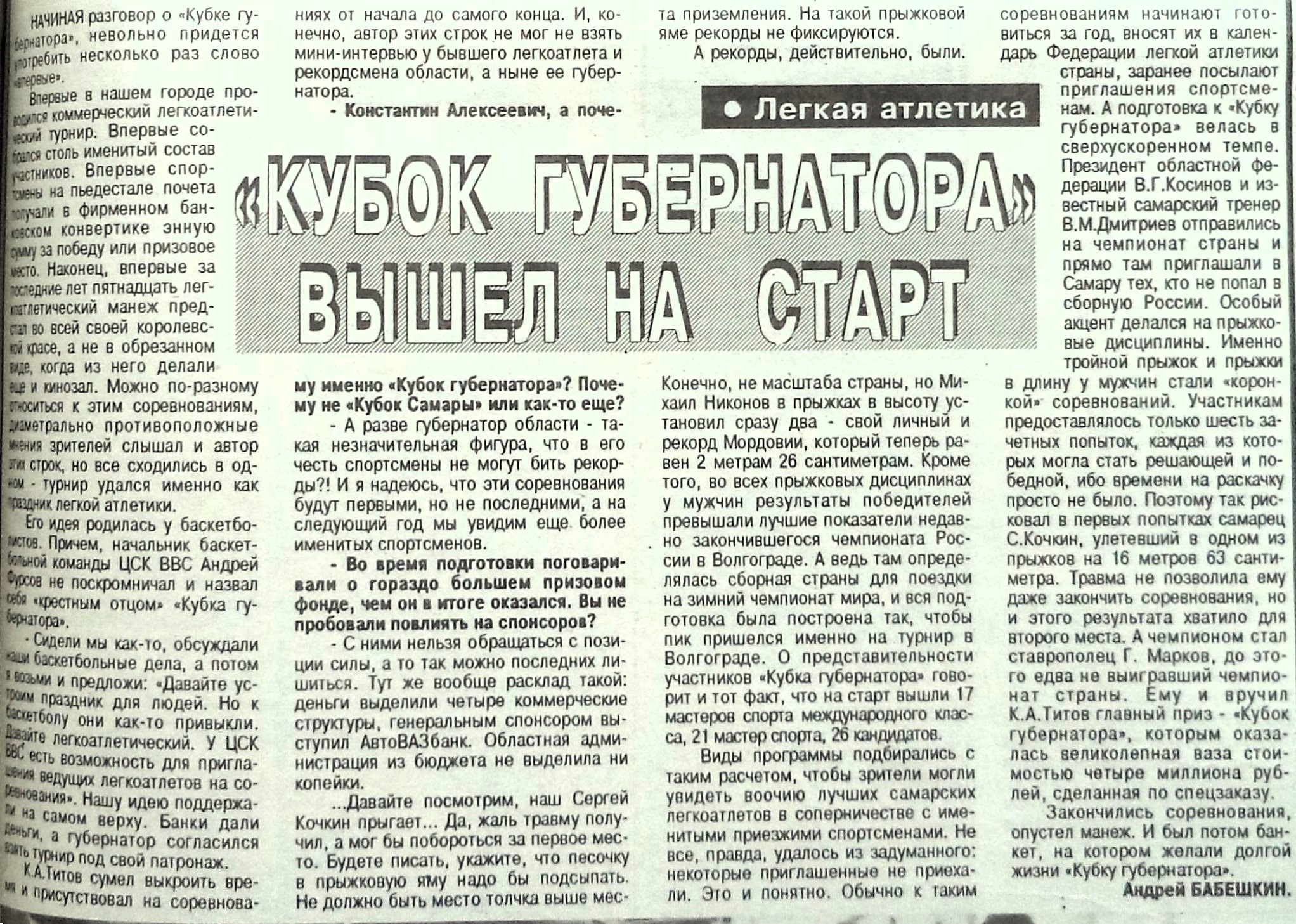 Скажем пару слов о легкой атлетике. В марте 1995 года во Дворце спорта авиационного завода (Физкультурная, 101) состоялся первый Кубок губернатора.