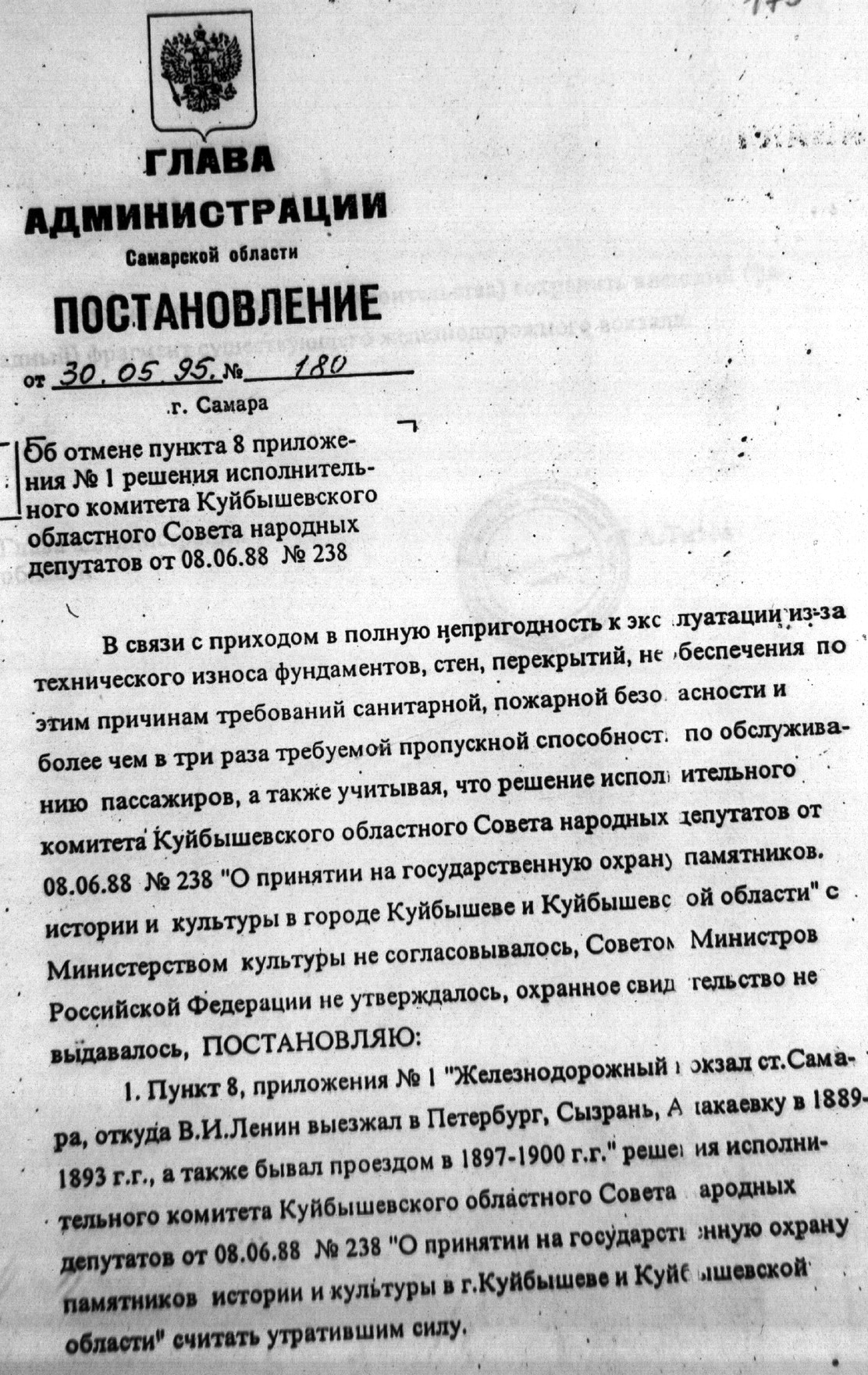 30 мая 1995 года из списка памятников истории и культуры был исключен знаковый для Самары объект — «Железнодорожный вокзал ст. Самара, откуда В.И. Ленин выезжал в Петербург, Сызрань, Алакаевку в 1889-1893 г.г., а также бывал проездом в 1897-1900 г.г.».