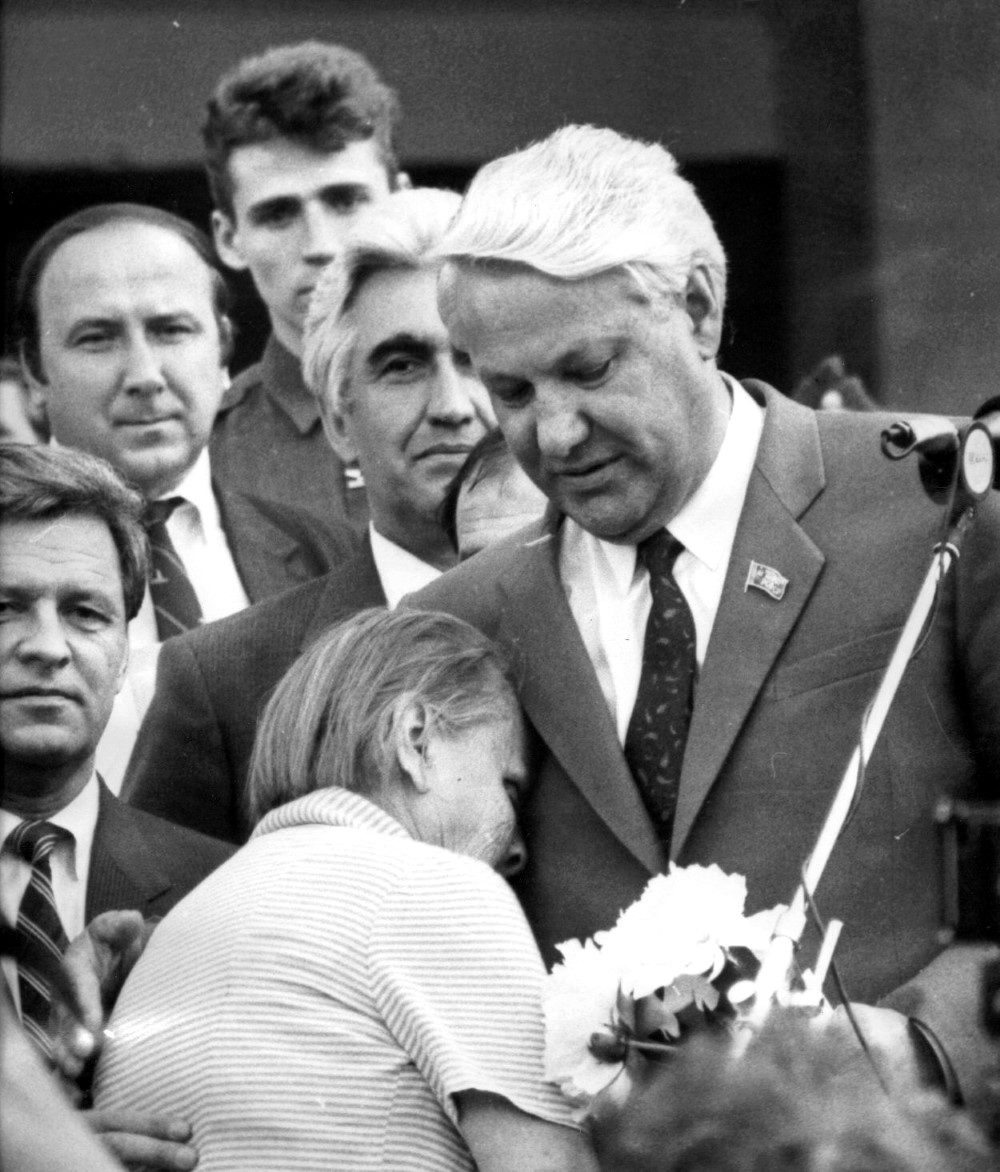 По воспоминаниям очевидцев, охрана подпустила к Ельцину нескольких старушек с цветами, одна из которых бросилась ему на грудь со словами: «Борис Николаевич, спаси Россию!».