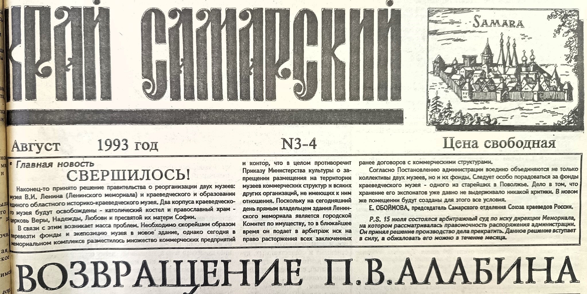 В конце 1991 года глава администрации Самарской области Константин Титов поддержал предложение депутатов облсовета народных депутатов и представителей общественности о передаче здания краеведческому музею.