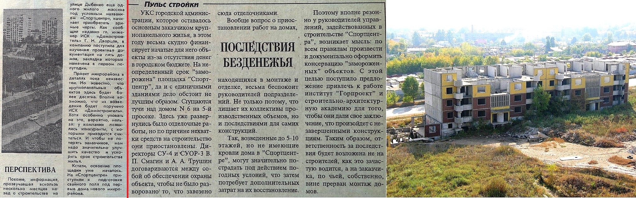 В 1994 году близ перекрестка улиц Дыбенко и Карбышева начали возводить микрорайон «Спортцентр». Однако уже спустя два года стройка была заморожена из-за финансовых сложностей и уже не возобновилась.