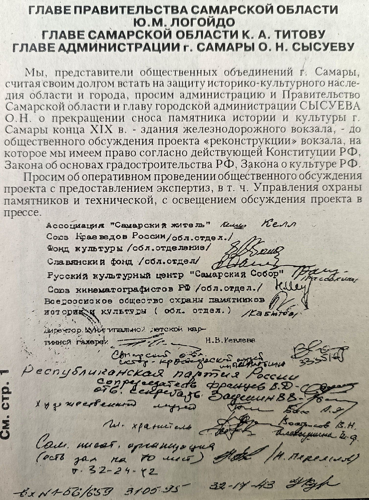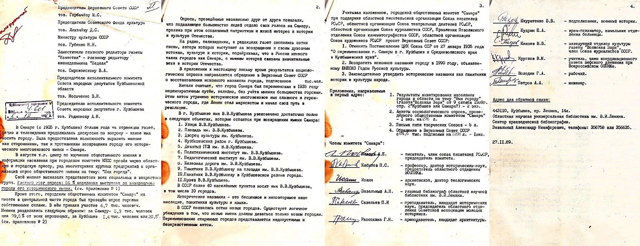 В разных частях города в 1989 году были организованы пикеты, где можно было подписать обращение в Верховный Совет о переименовании Куйбышева в Самару. Таких подписей было собрано 80 тысяч.