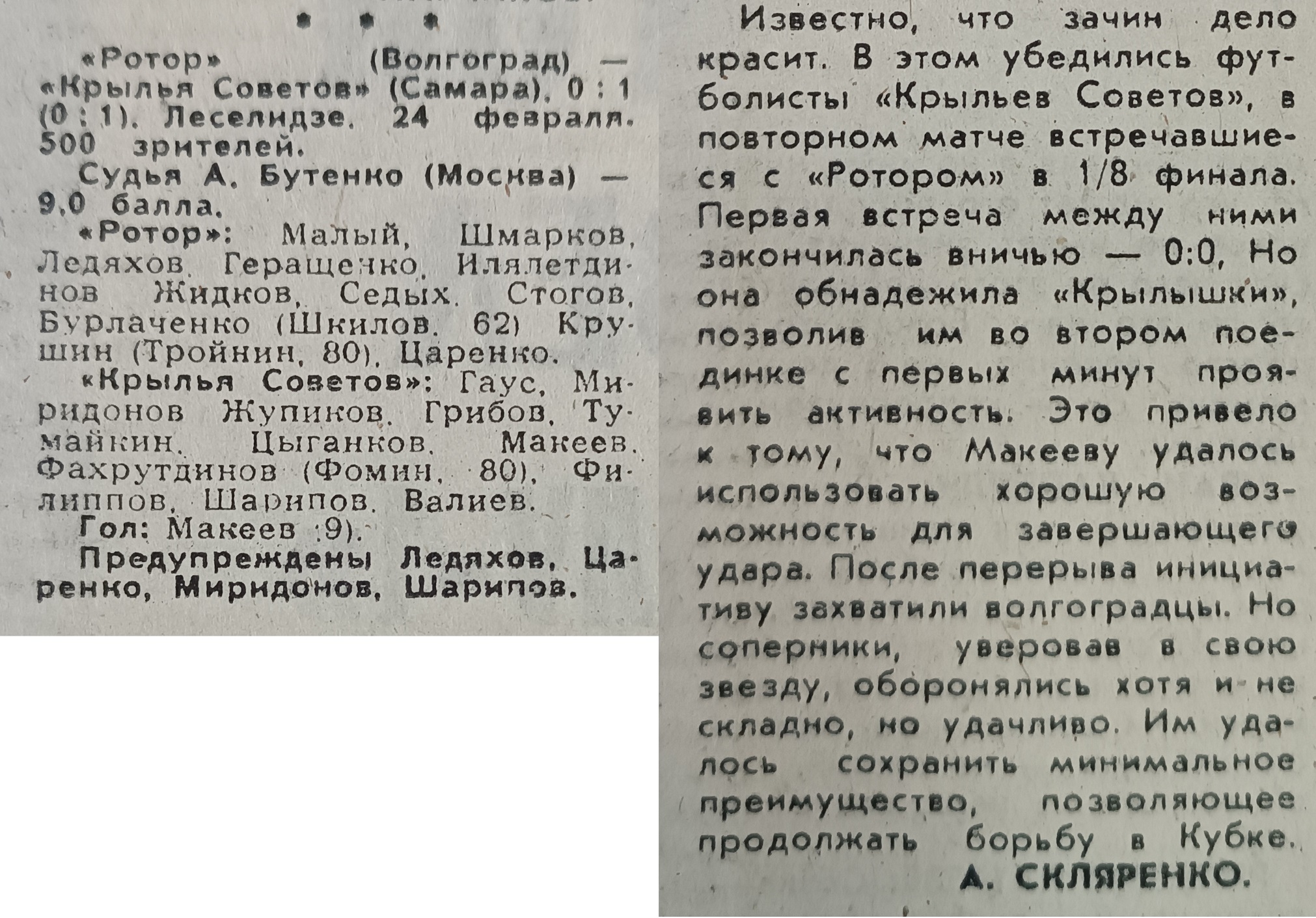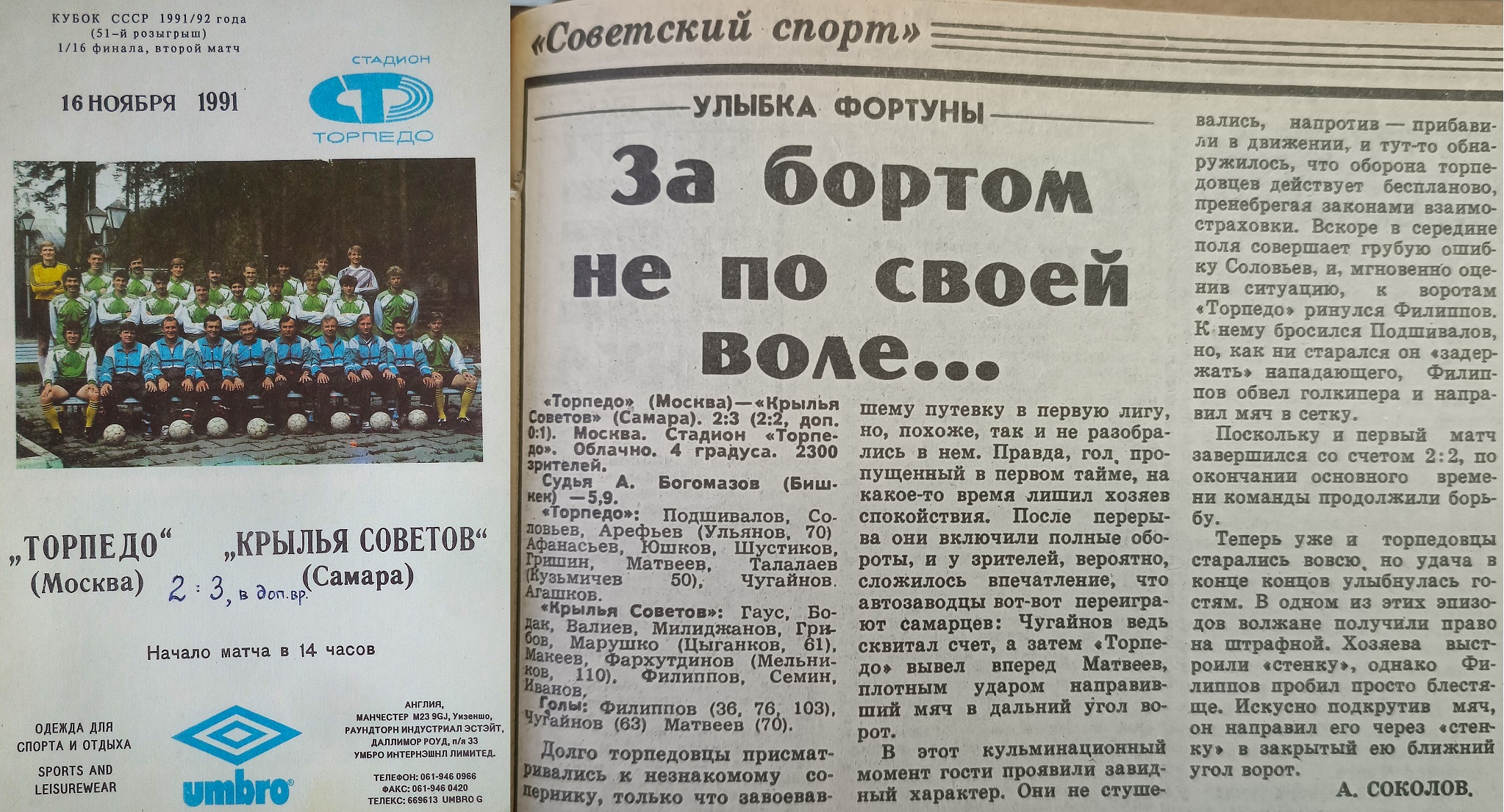 Тогда наша команда провела несколько удачных матчей в Кубке СССР — СНГ по футболу. Так, 15 ноября 1991 года в 1/16 этого турнира «Крылышки» на выезде со счетом 2:3 обыграли «Торпедо».