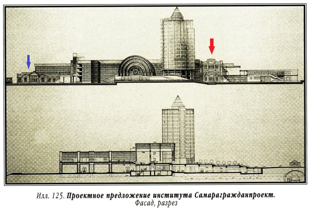 Кроме того, планировалось сохранить исторические постройки — здание билетных касс (синяя стрелка) и ресторан (красная стрелка).