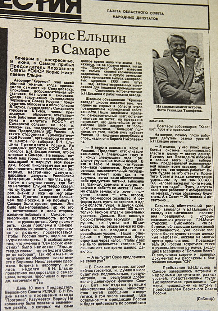 Визит в Самару был не запланированным. Видимо, Борис Николаевич посчитал важным вызвать симпатии жителей космической столицы страны перед назначенными на 12 июня первыми президентскими выборами.