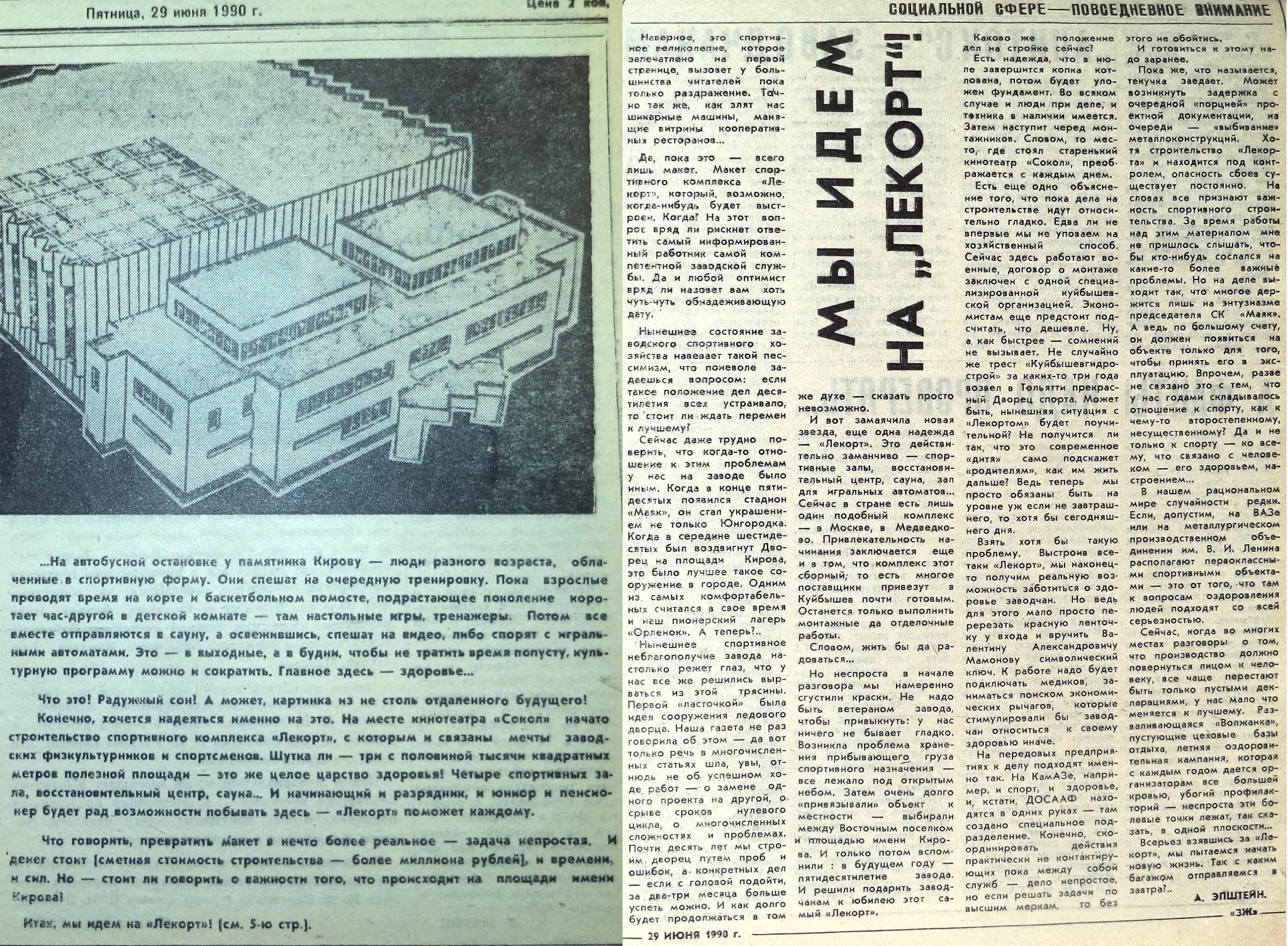 Упомянем и о масштабном проекте соседа ЦСКБ — завода «Прогресс». Ракетчики вознамерились возвести в квартале за Дворцом культуры на площади Кирова большой спортивный комплекс. Назвали его «Лекортом».