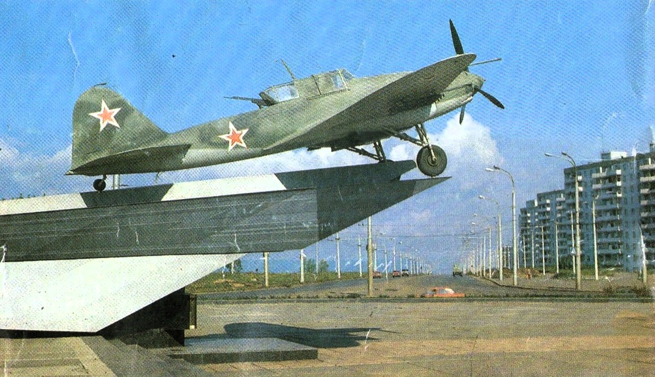 Памятник штурмовику Ил-2. Обратите внимание, что на снимке видна застройка только по нечетной стороне проспекта Кирова, а расположенного на четной стороне микрорайона «Ипподром» еще нет.