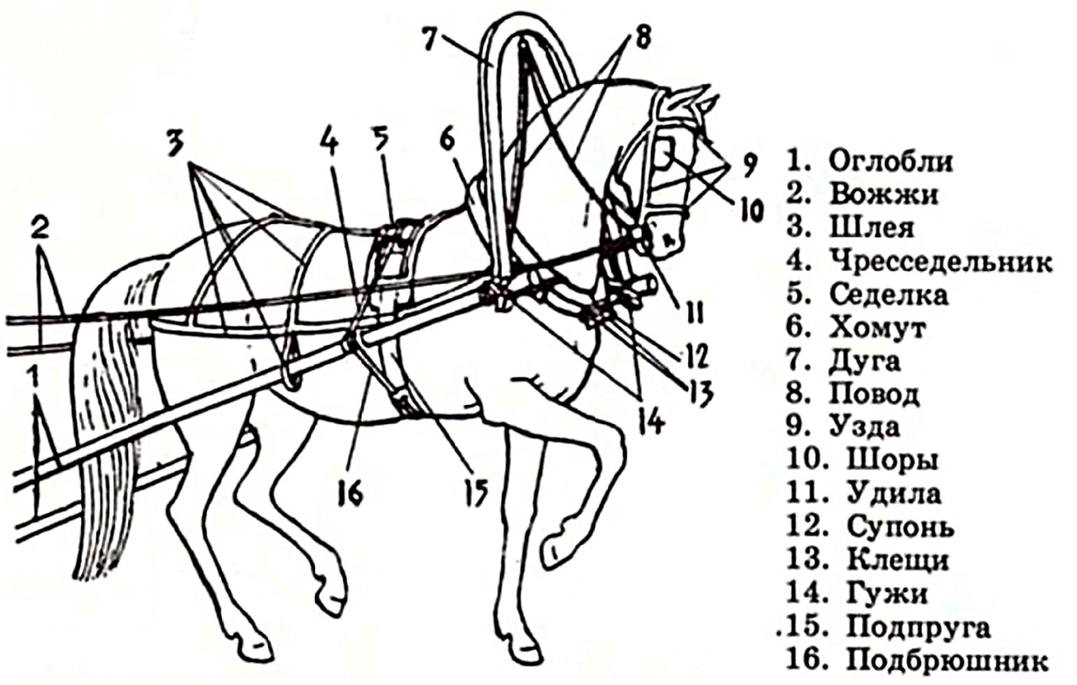 Она состояла из многих элементов: вожжей, шлеи, постромков, подпруги, гужа, хомута, удил, уздечки и собственно шор.