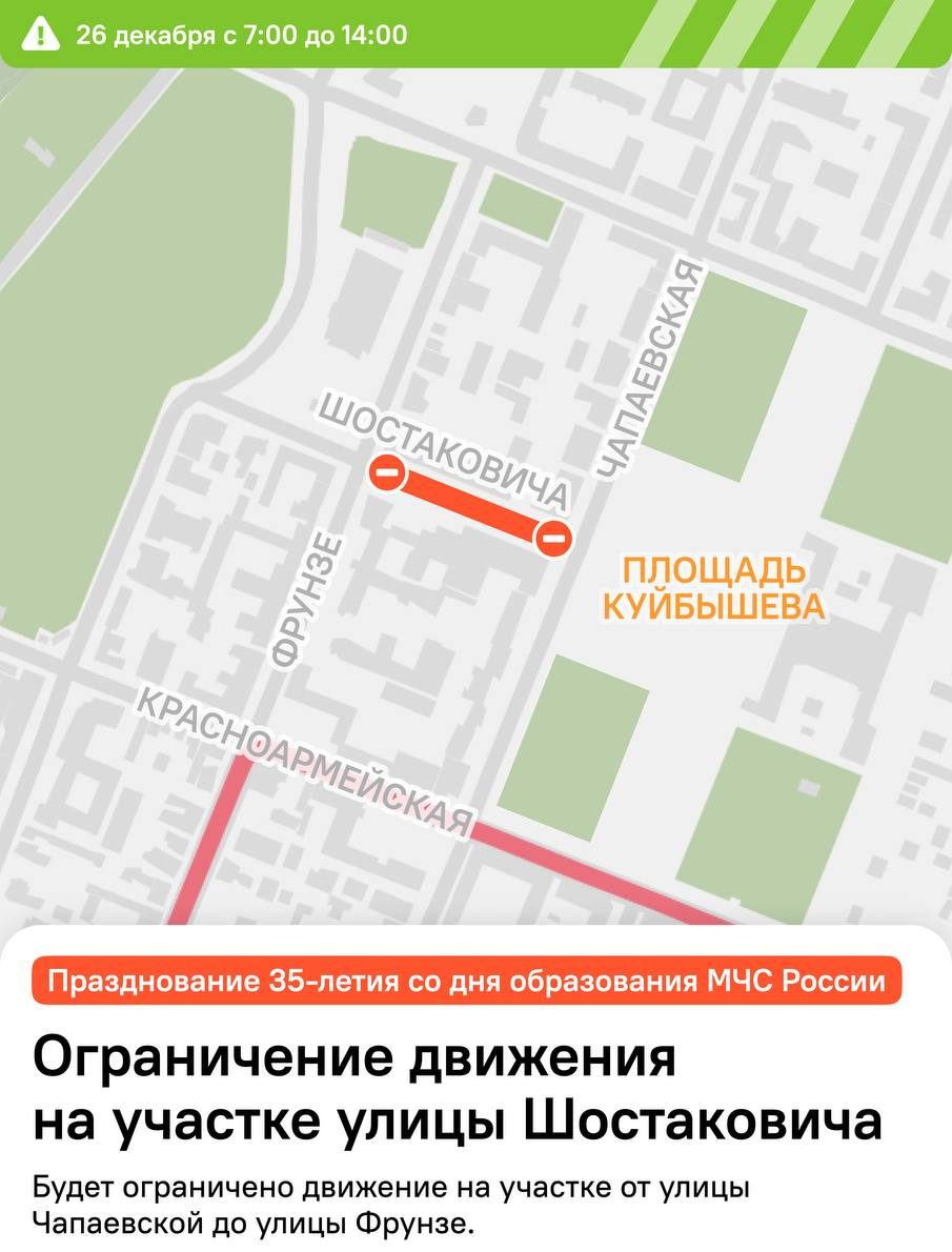 В связи с этим 26 декабря с 7:00 до 14:00 будет ограничено движение транспорта, в том числе средств индивидуальной мобильности, по улице Шостаковича от улицы Фрунзе до Чапаевской.