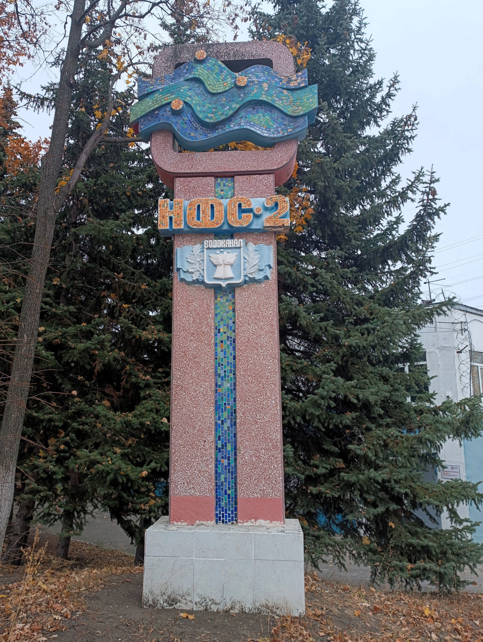 Пожалуй, самый интересный объект из нашей подборки. Стела украшена не только мозаикой из смальты, но и гербом Водоканала.