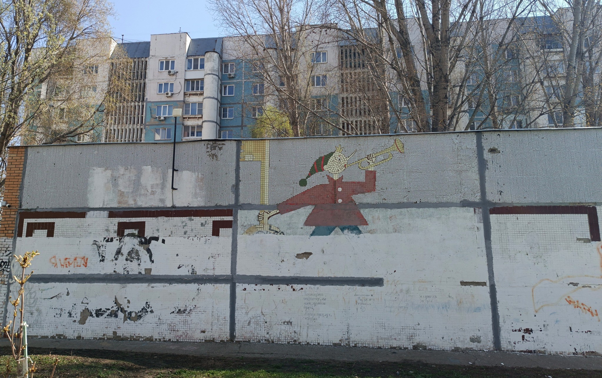 Отыскать эту, к сожалению, наполовину закрашенную мозаику можно между домом № 10 по улице Губанова и детским садом № 149 (Аминева, 17). Подробнее о застройке этого района вы можете прочесть здесь.