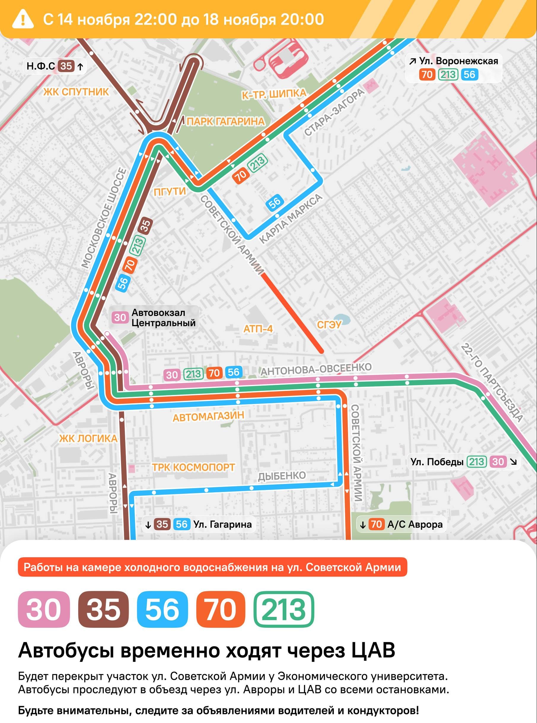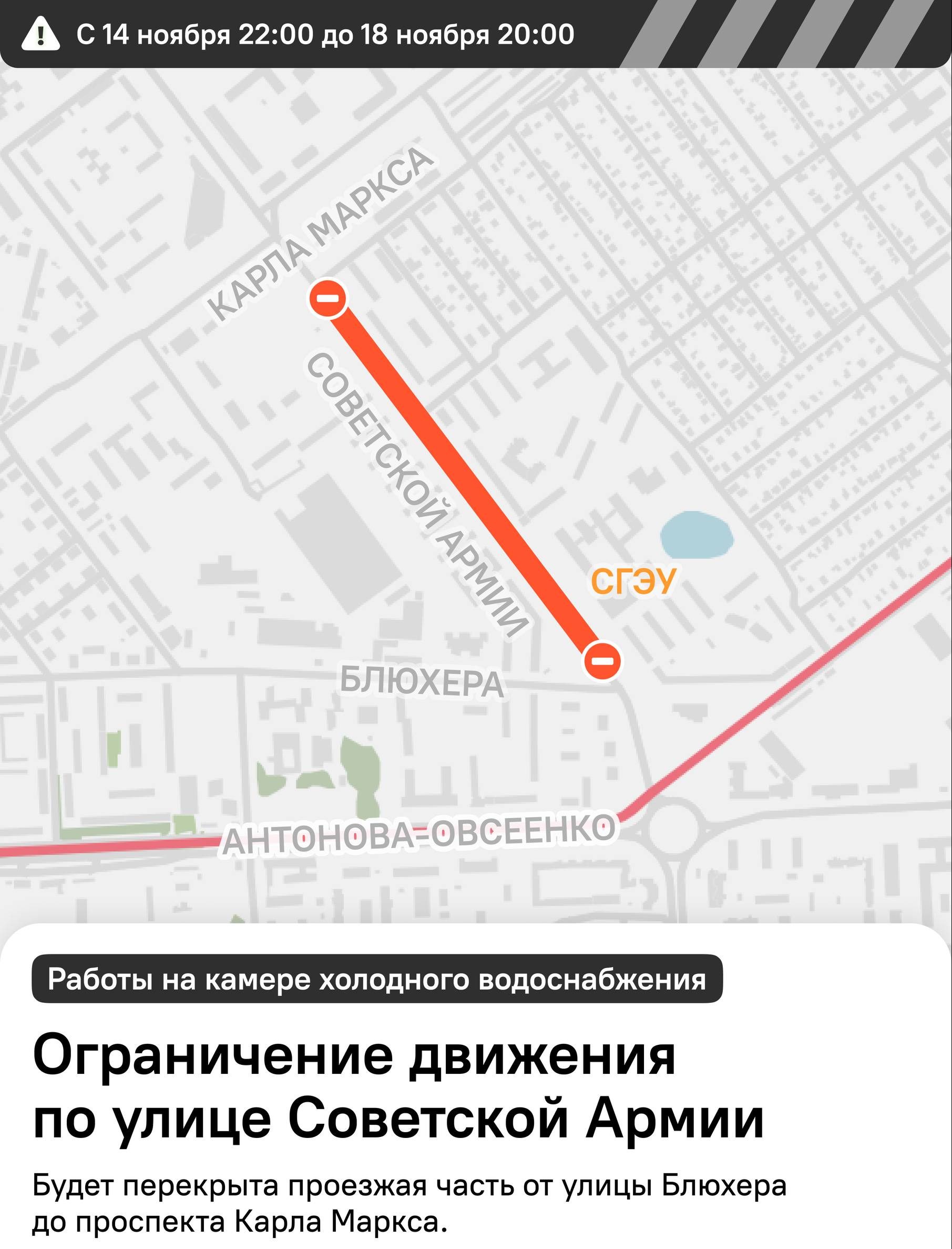 С 22:00 14 ноября до 20:00 18 ноября нельзя проехать по улице Советской Армии в границах улицы Блюхера и проспекта Карла Маркса.