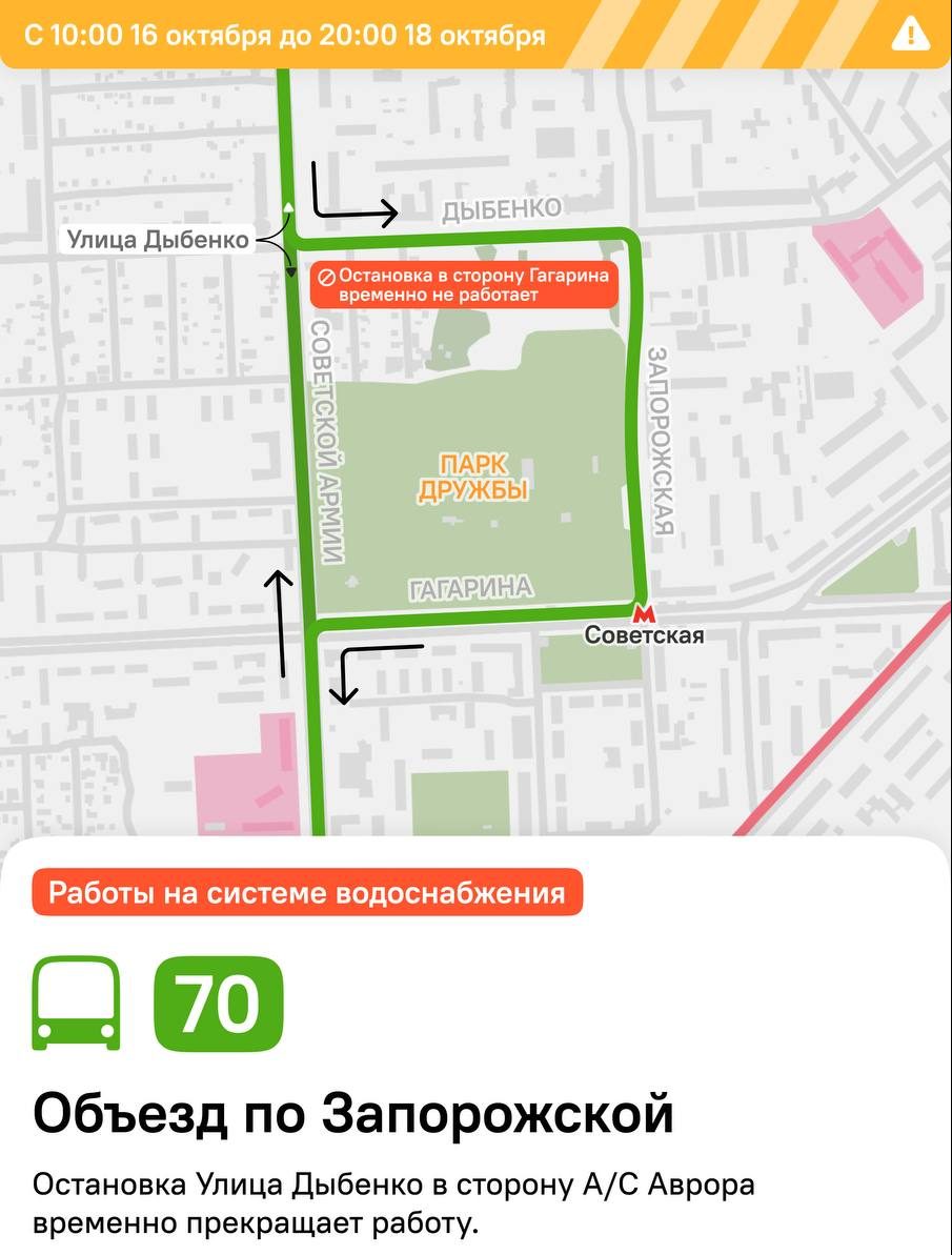 Автобусы маршрута № 70 при движении «в город» будут объезжать перекрытый участок по улицам Дыбенко, Запорожской и Гагарина, далее по своему маршруту.