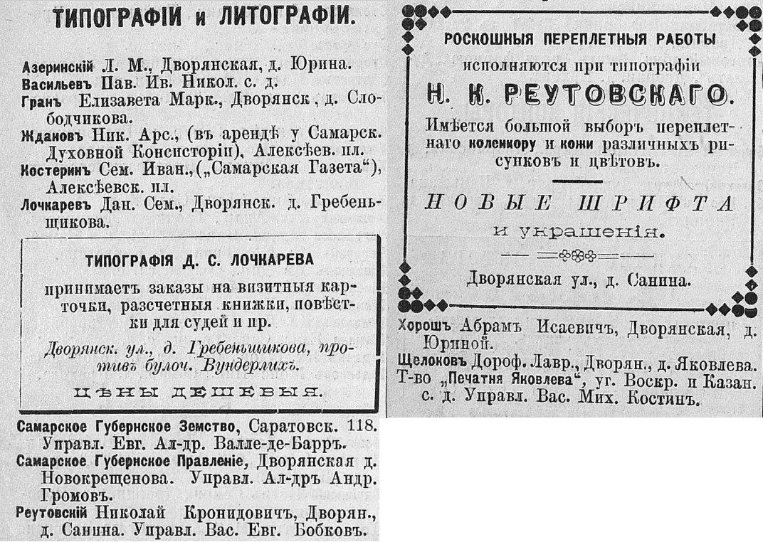 На рубеже XIX — XX веков в Самаре работало более десяти типографий. Вот их список из адрес-календаря на 1900 год.